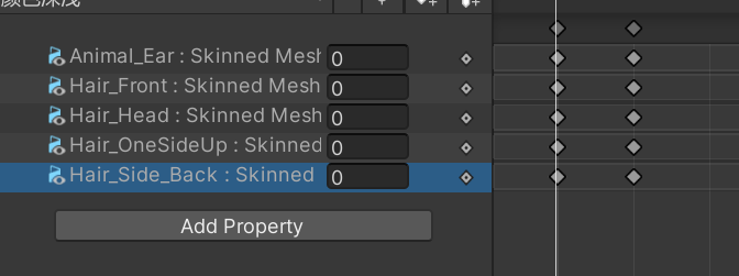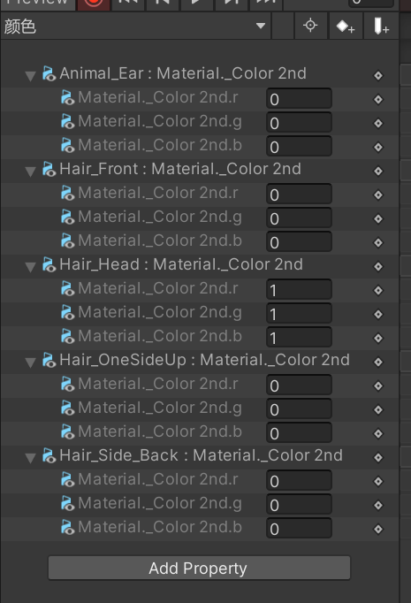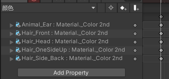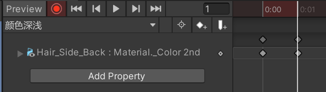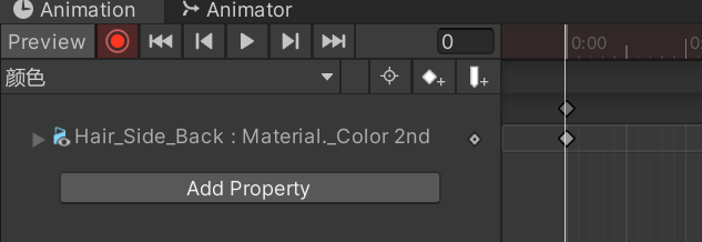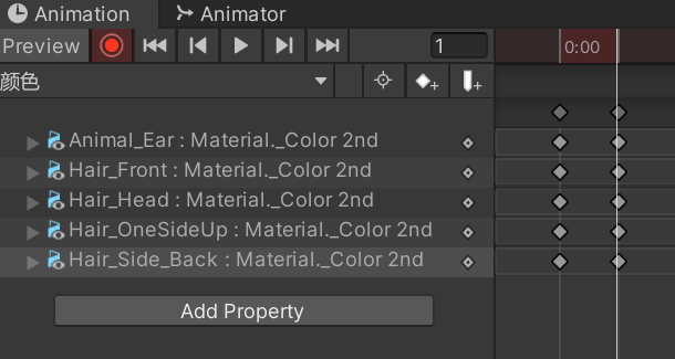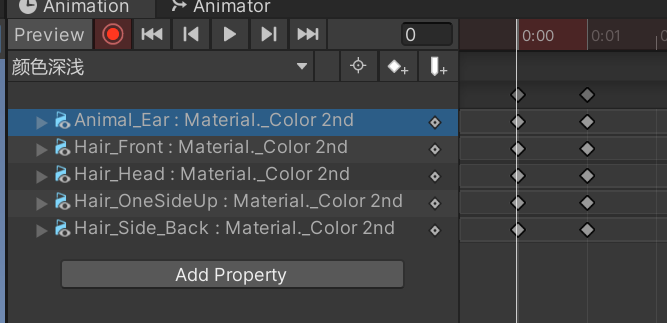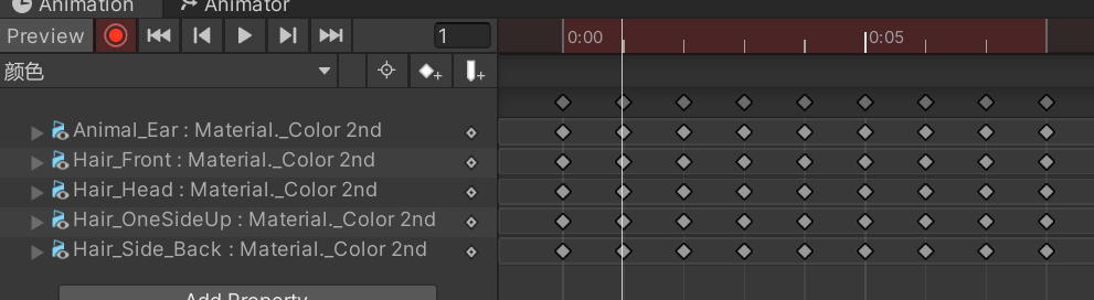 15)点击红色进行动画录制。然后找到所有和头发有关对象的着色器的第二主色的颜色。