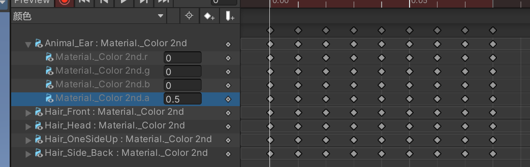 29)然后找到上面修改颜色的所有头发对象,这里修改第二主色的透明度,将第一个关键帧的透明度为0,第二个为1。