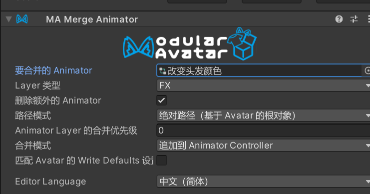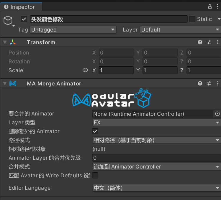 38)然后在头发颜色修改对象的Inspector里面添加MA Merge Animator组件。