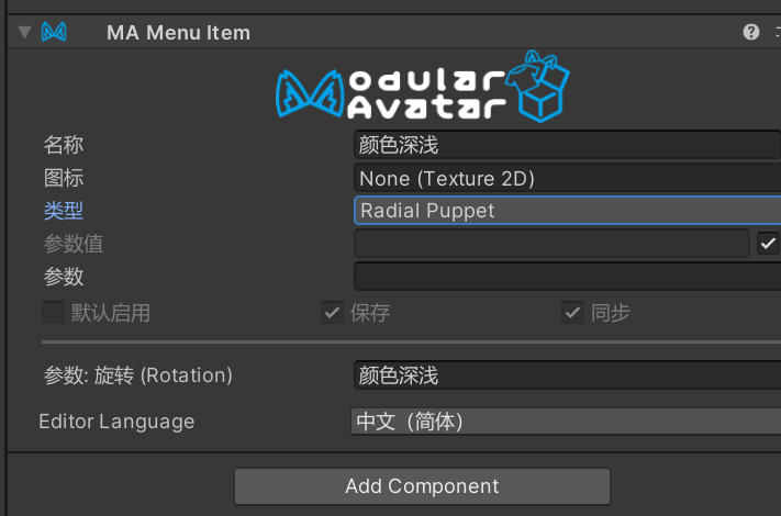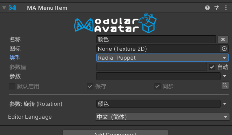 43)点击颜色,添加MA Menu Item组件,修改类型为Radial Puppet,参数,旋转选择使用的参数。