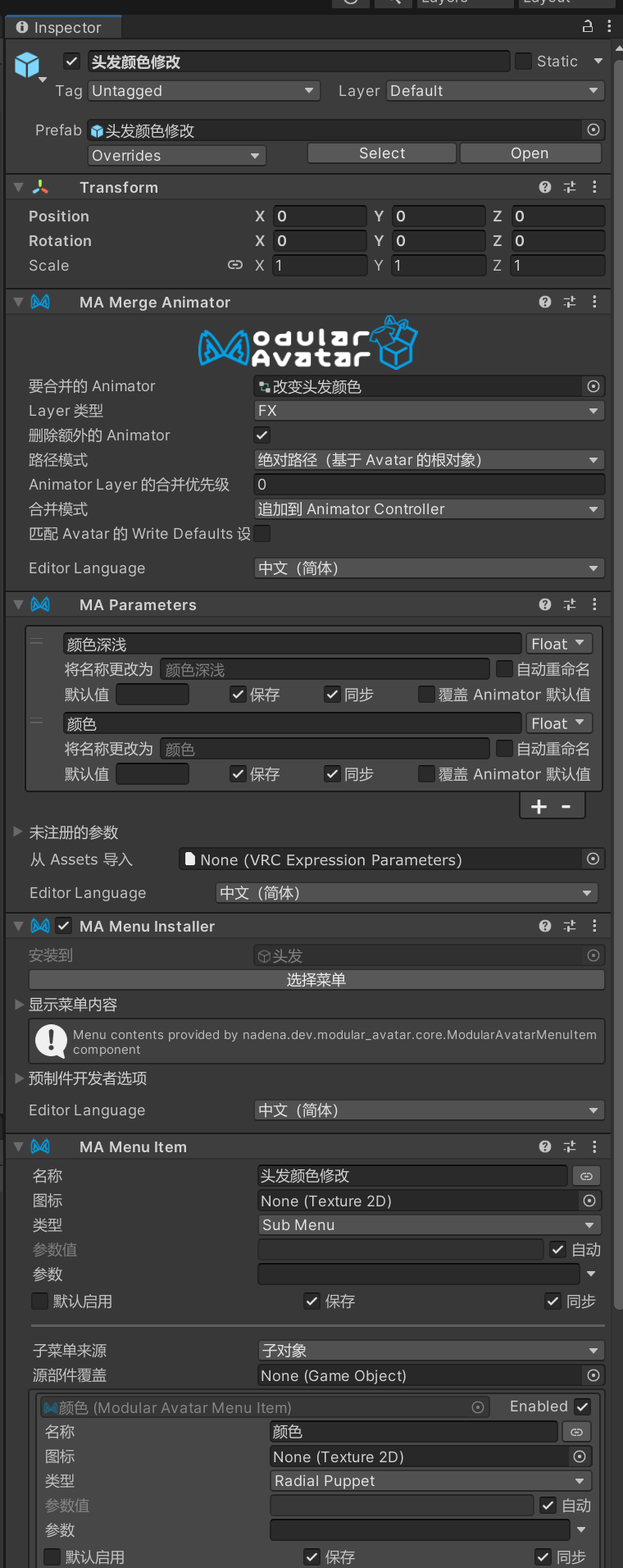 46)修改头发颜色修改的菜单安装位置,完整配置完如下所示。