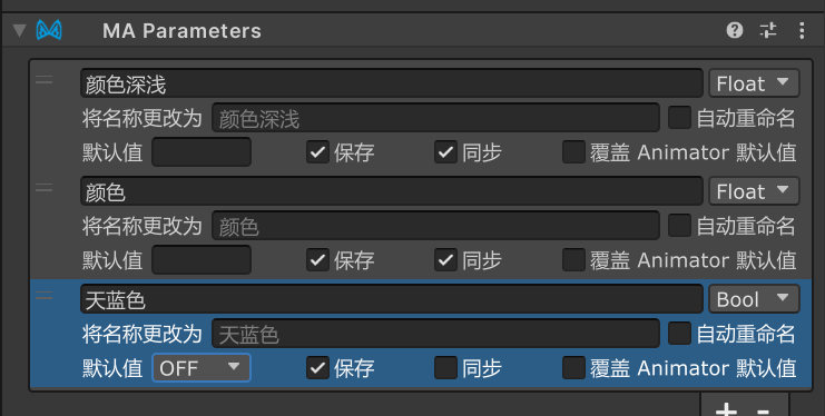 55)然后进入预制件修改,从未注册的参数将天蓝色参数变量添加进去,并且修改未Bool类型,默认值OFF,保存,不同步。