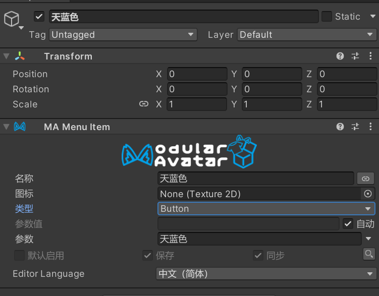 56)然后添加一个天蓝色对象,添加MA Menu Item,并如下配置。